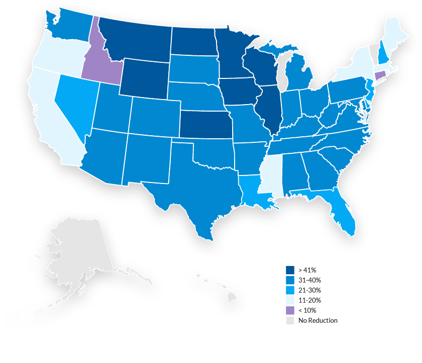 Arkansas, Arizona, California, Colorado, Connecticut, Delaware, Florida, Georgia, Hawaii, Illinois, Iowa, Kansas, Kentucky, Louisiana, Michigan, Minnesota, Nebraska, New Hampshire, New Jersey, New Mexico, North Carolina, North Dakota, Oklahoma, Oregon, Pennsylvania, South Carolina, Texas, Utah, Vermont, Virginia, Washington, West Virginia, Wisconsin