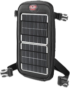 Small solar panel and integrated battery. Typically includes a stand or mounting mechanism allowing the user to position the device for maximum sunlight. Premium models recognize the type of connected device and feature LED readouts of sun-exposure levels. Some have rugged exterior construction suitable for outdoor use.